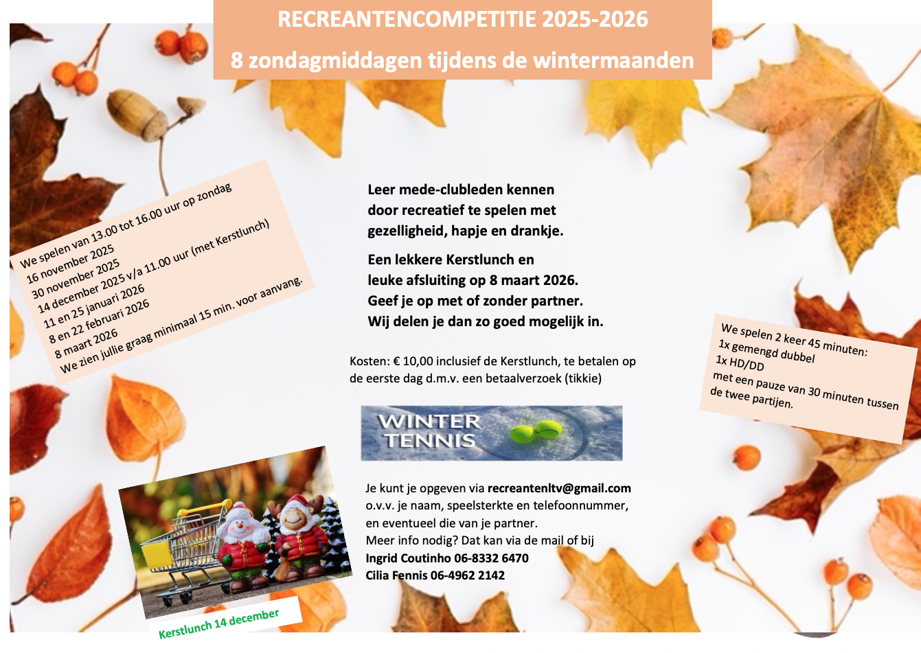 In de wintermaanden organiseren we elk jaar een recreantencompetitie binnen onze eigen vereniging. Er wordt 8 keer gespeeld op zondagmiddag, alleen dubbels en gemengd dubbels. Daarnaast genieten we elk jaar van een overheerlijke kerstlunch. Een uitstekende gelegenheid om meer leden te leren kennen en gezelligheid op en naast de baan te beleven. Deze interne competitie is specifiek gericht op leden met speelsterkte 7, 8 en 9.