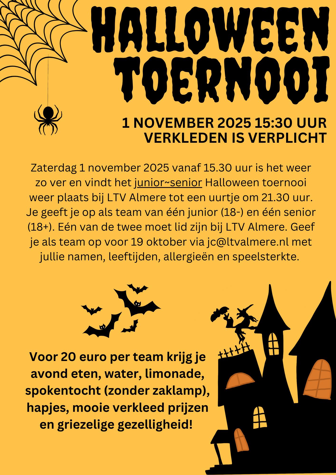 Vorig jaar melden zich 65 verkleedde junior-senior tenniskoppels waarvan 1 van de 2 in ieder geval lid was van LTV Almere. Gaan we dit jaar over de 65 koppels heen? De dag staat in het teken van griezelige gezelligheid, samen eten (in shifts) en een engere spokentocht dan vorig jaar. Ook dit jaar zijn er weer verkleedprijzen te winnen.