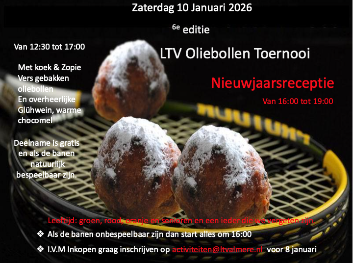 Op zaterdag 10 januari 2026 organiseren we met veel plezier voor de zesde keer het jaarlijkse Oliebollen Toernooi! Dit gezellige evenement is inmiddels een traditie geworden binnen onze vereniging en is geschikt voor jong en oud. Of je nu een ervaren speler bent of nog maar net begint, iedereen is van harte welkom om mee te doen aan deze sportieve dag.