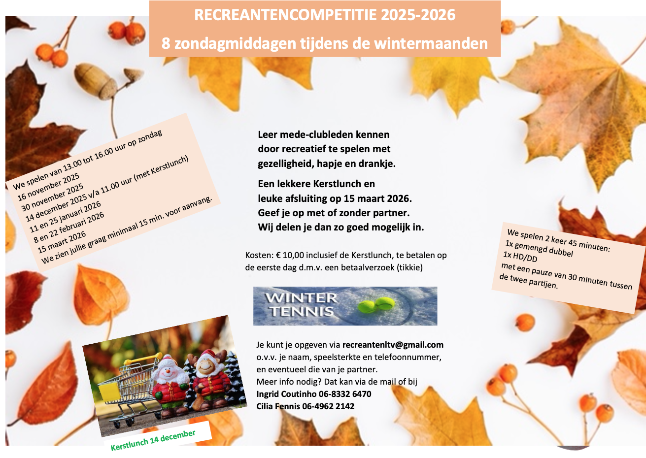 In de wintermaanden organiseren we elk jaar een recreantencompetitie binnen onze eigen vereniging. Er wordt 8 keer gespeeld op zondagmiddag, alleen dubbels en gemengd dubbels. Daarnaast genieten we elk jaar van een overheerlijke kerstlunch.
